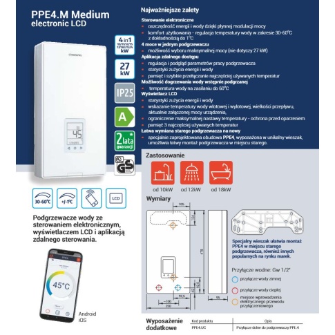 - specjalnie zaprojektowana obudowa PPE4, wyposażona w unikalny wieszak, umożliwia łatwy montaż podgrzewacza w miejscu starego.