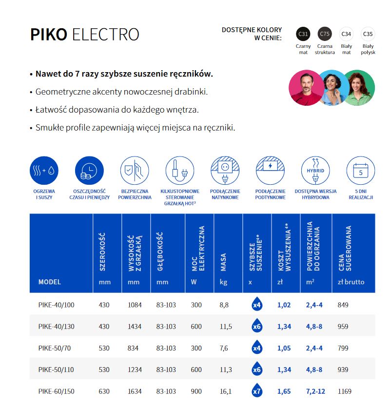 Grzejnik łazienkowy PIKO ELECTRO to wyjątkowy produkt! Spełnia oczekiwania zarówno poszukiwaczy typowo użytkowych korzyści, jak i osób zwracających dużą uwagę na wygląd urządzenia. Łączy w sobie bowiem niezawodne działanie i sprawdzoną konstrukcję odporną na uszkodzenia, a także nowoczesny design z wysoką precyzją wykończenia. Poprzez geometryczne akcenty dodaje charakteru nawet najprostszej aranżacji. Jednocześnie może zostać łatwo dopasowany do każdego wnętrza, dając efekt zachwycającej spójności z otoczeniem. W PIKO ELECTRO – tak, jak w innych grzejnikach – każdy element tworzymy z najwyższą starannością. To uwidacznia się w solidności całego produktu, również najmniejszych detali. Dzięki temu grzejnik przyciąga spojrzenia i zapada w pamięć. Dostępny jest w 23 kolorach z palety IP. Za dodatkową opłatą możemy przemalować go na dowolny kolor z palety RAL.