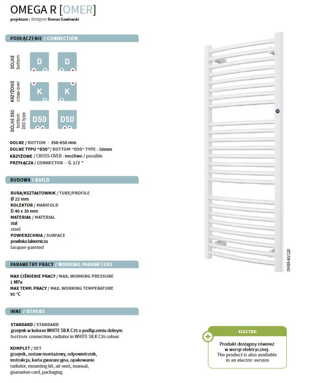 OMEGA R to tradycyjny grzejnik w nowoczesnej odsłonie. Jego klasyczna, smukła konstrukcja sprawia, że zajmuje niewiele miejsca, przez co wpasuje się w przestrzeń każdej łazienki. Dla komfortu użytkowania posiada możliwość regulacji odległości od ściany.